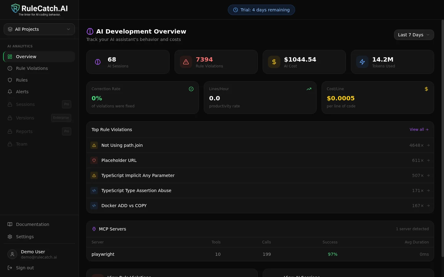 Install the Rulecatch™ MCP server in Claude Code or any MCP-compatible tool that supports hooks to query your violation data. Then just ask.